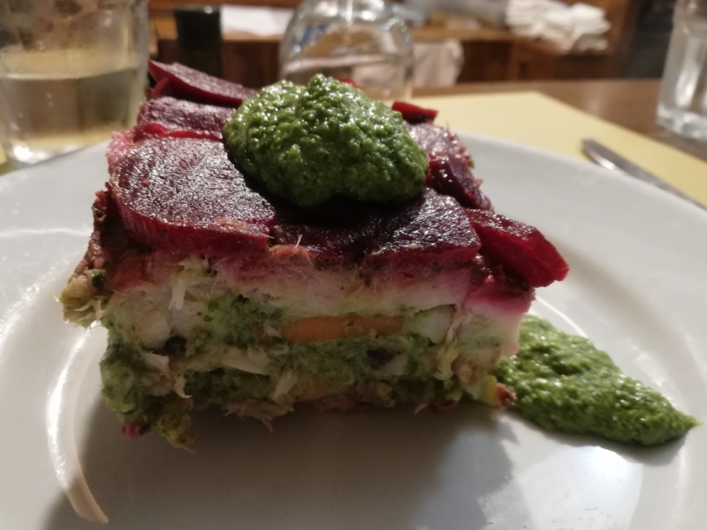リグーリア州の代表的な料理にも拘わらず、今まで食べる機会がなかったのですが、カッポン・マーグロの美味しい店があるからと友達に誘われ行ってきました。 野菜と魚介類を層にして、ジェノバペーストで飾られた上品な一品で、出てきたときは思わず、わ~と声をあげてしまいました。 元々Genovaの裕福な家庭で働いていた使用人が、残り物のありあわせ
